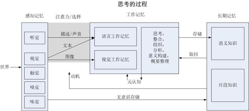 感知记忆(working memory):从人类感知器官获得的信息会无意识地存储到长期记忆中的情景记忆中。但是这种记忆衰减得非常快,存储时间为几毫秒。只有当主体注意到感知记忆中的内容时才会将感知记忆传送到工作记忆。一旦进入工作记忆,主体就会有意识地对其进行思考并将其放入长期记忆当中。