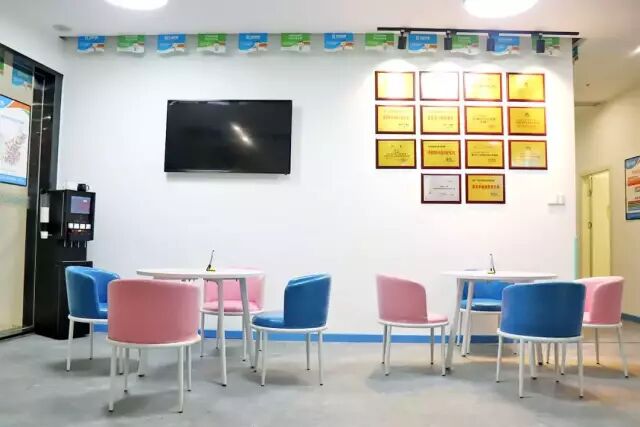 家长等候区配备自助咖啡、奶茶、橙汁饮料机和几张舒适的桌椅。在等候区冲上一杯饮料,惬意享受美味的同时,通过墙上的电视观看孩子上课的情况,让孩子在学习的时候家长也能小憩一会。