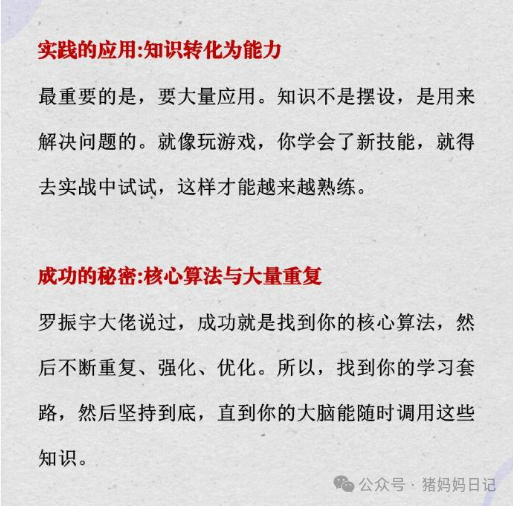 正如罗振宇所说,成功在于找到你的“核心算法”,然后通过不断重复、强化,使其成为你解决问题的利器。每个人的成功路径不同,但都在于找到有效的学习套路,并坚持到底。